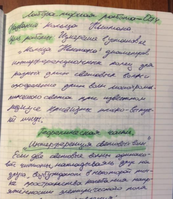 ЦЕЛЬ РАБОТЫ: измерение в установке «Кольца Ньютона» диаметров интерференционных колец для разных длин световых волн и определение длин волн монохроматического света при известном радиусе кривизны плоско-выпуклой линзы.