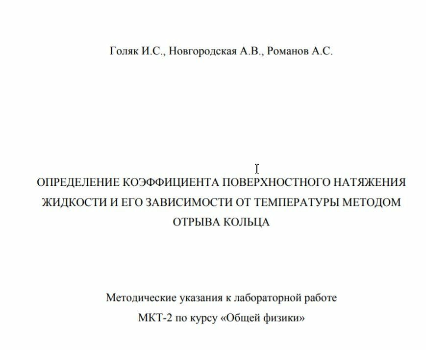 Главная » Учебные материалы » Физика » Лабораторные работы » МГТУ им. Н.Э.Баумана » 2 семестр » Номер МКТ » Вариант 2 » Определение коэффициента поверхностного натяжения жидкости и его зависимости от температуры методом отрыва кольца