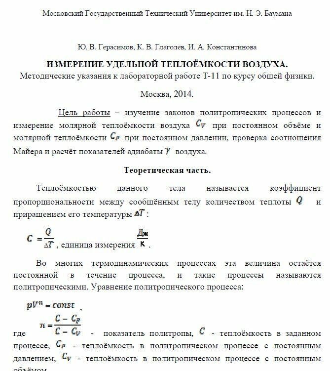 Для студентов МГТУ им. Н.Э.Баумана по предмету ФизикаИзмерение удельной теплоемкости воздухаИзмерение удельной теплоемкости воздуха