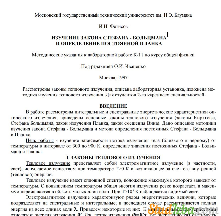 Для студентов МГТУ им. Н.Э.Баумана по предмету ФизикаИзучение закона Стефана-Больцмана и определение постоянной ПланкаИзучение закона Стефана-Больцмана и определение постоянной Планка