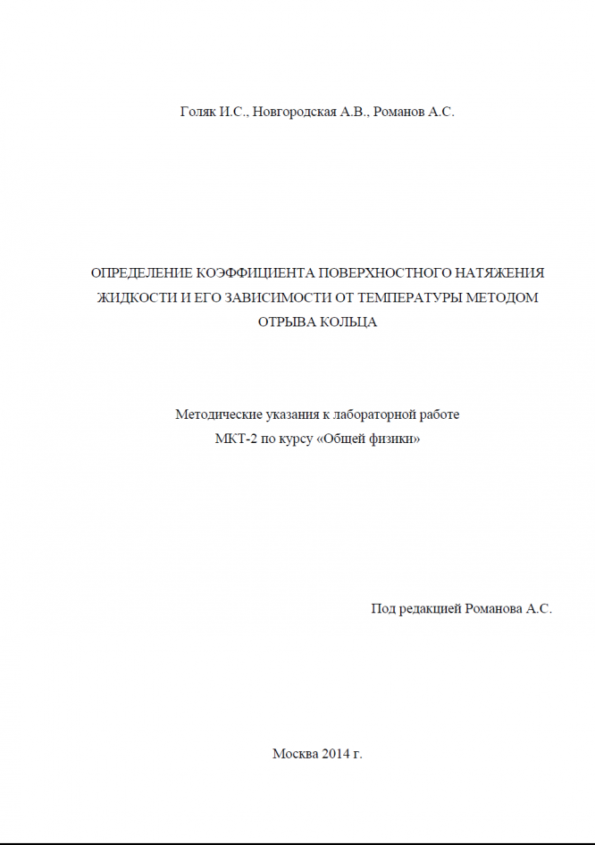Для студентов МГТУ им. Н.Э.Баумана по предмету ФизикаОпределение коэффициента поверхностного натяжения жидкости и его зависимости от температуры методом отрыва кольцаОпределение коэффициента поверхностного натяжения жидкости и его зависимости от температуры методом отрыва кольца