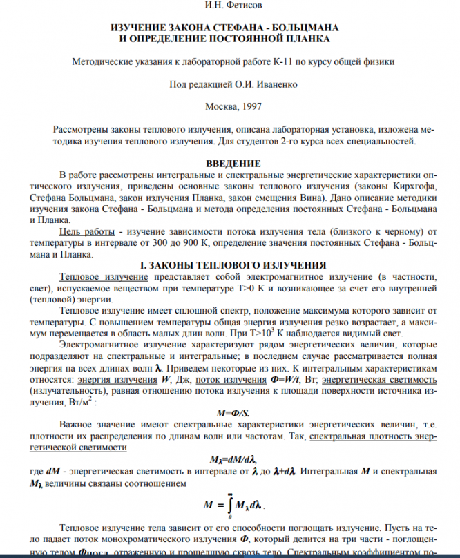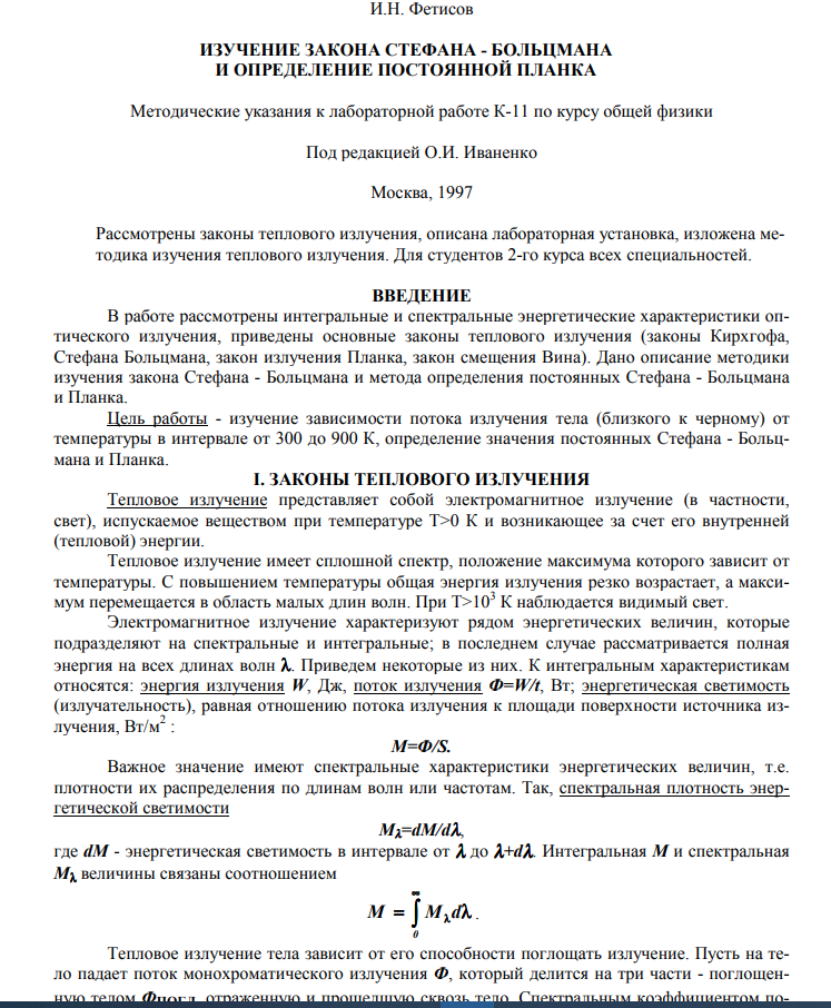 Для студентов МГТУ им. Н.Э.Баумана по предмету ФизикаИзучение закона Стефана-Больцмана и определение постоянной ПланкаИзучение закона Стефана-Больцмана и определение постоянной Планка