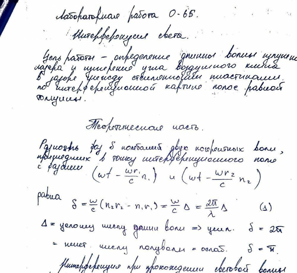 Цель работы — определение длины волны излучения лазера и измерение угла воздушного клина в зазоре между стеклянными пластинами по интерференционной картине полос равной толщины.