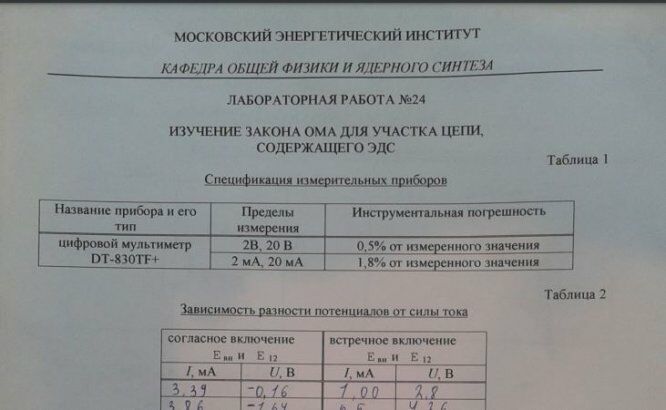 Для студентов НИУ «МЭИ» по предмету ФизикаЛаботарная работа №24 (Изучение закона Ома для участка цепи, содержащего ЭДС)Лаботарная работа №24 (Изучение закона Ома для участка цепи, содержащего ЭДС)
