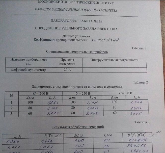 Лабораторная работа 27: Лабораторная №27 (Определение удельного заряда электрона)