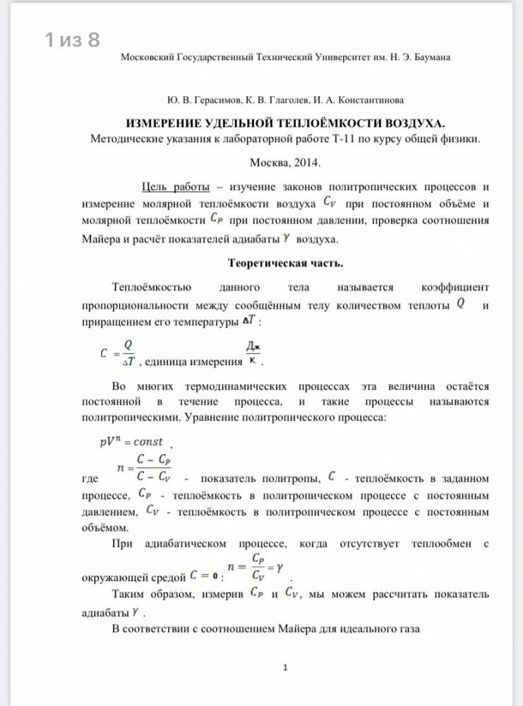 Для студентов МГТУ им. Н.Э.Баумана по предмету ФизикаИзмерение удельной теплоемкости воздухаИзмерение удельной теплоемкости воздуха