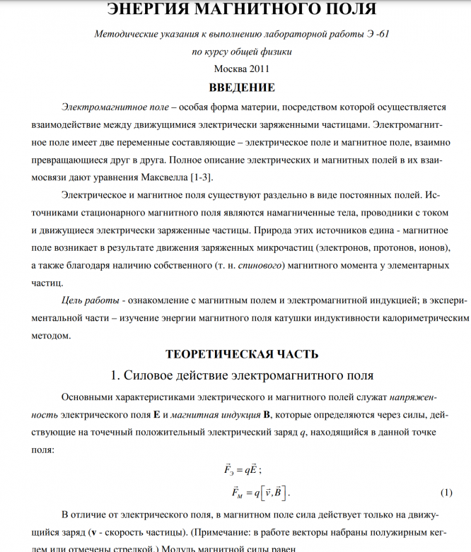 Электромагнитное поле – особая форма материи, посредством которой осуществляется взаимодействие между движущимися электрически заряженными частицами. Электромагнитное поле имеет две переменные составляющие – электрическое поле и магнитное поле, взаимно превращающиеся друг в друга. Полное описание электрических и магнитных полей в их взаимосвязи дают уравнения Максвелла [1-3]. Электрическое и магнитное поля существуют раздельно в виде постоянных полей. Источниками стационарного магнитного поля являются намагниченные тела, проводники с током и движущиеся электрически заряженные частицы. Природа этих источников едина - магнитное поле возникает в результате движения заряженных микрочастиц (электронов, протонов, ионов), а также благодаря наличию собственного (т. н. спинового) магнитного момента у элементарных частиц. Цель работы - ознакомление с магнитным полем и электромагнитной индукцией; в экспериментальной части – изучение энергии магнитного поля катушки индуктивности калориметрическим методом.