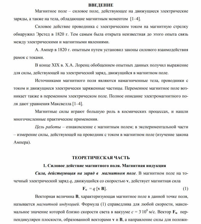 Источниками магнитного поля являются намагниченные тела, проводники с током и движущиеся электрически заряженные частицы. Переменное магнитное поле возникает также в переменном электрическом поле. Полное описание электромагнитного поля дают уравнения Максвелла [1–4]. Магнитные силы играют большую роль в космических процессах, и нашли многочисленные практические применения. Цель работы – ознакомление с магнитным полем; в экспериментальной части – измерение силы, действующей на проводник с током в магнитном поле (изучение закона Ампера).