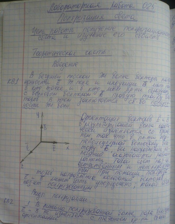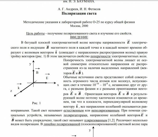 Ответ не все КОНТРОЛЬНЫЕ ВОПРОСЫЦель работы - получение поляризованного света и изучение его свойств. ВВЕДЕНИЕ В бегущей плоской электромагнитной волне векторы напряженности E !!" электрического поля и индукции B !" магнитного поля в каждой точке и в каждый момент времени образуют с волновым вектором k !" (совпадает с направлением распространения волны) правую тройку векторов (рис. 1) В этом заключается свойство поперечности электромагнитных волн. Поперечность электромагнитной волны лишает ее осевой симметрии относительно направления ее распространения из-за наличия выделенных направлений (векторов E !!" и B !" ).