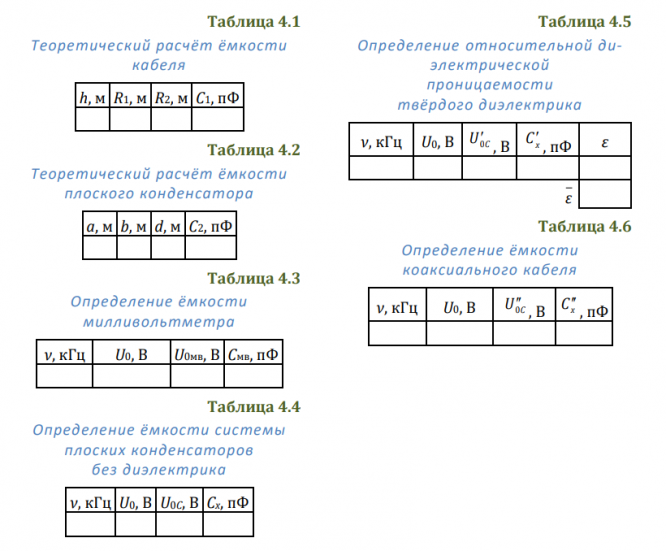 Цель работы: экспериментальное определение и теоретический расчёт электрической ёмкости плоского конденсатора и коаксиального кабеля; расчёт диэлектрической проницаемости твёрдого диэлектрика, помещённого между обкладками плоского конденсатора.