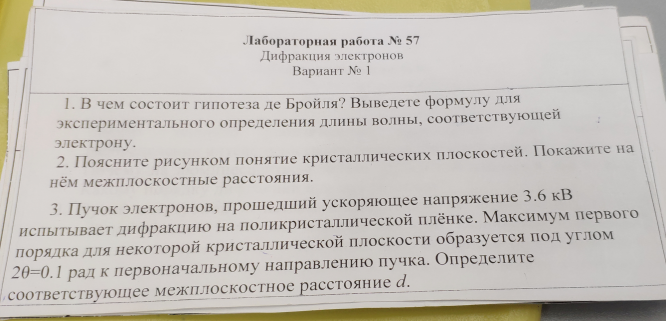 3. Пучок электронов, прошедший ускоряющее напряжение 3.6 кВ испытывает дифракцию на поликристаллической плёнке. Максимум первого порядка для некоторой кристаллической плоскости образуется под углом 2θ =0,1 рад к первоначальному направлению пучка. Определите соответствующее межплоскостное расстояние d.