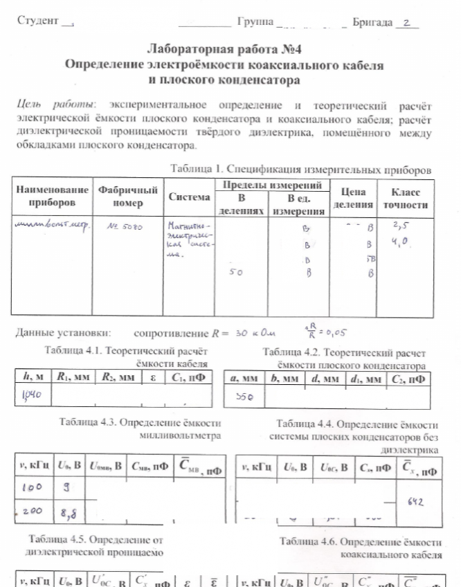 Зачтенная лабораторная работа по физике №4 "Определение ёмкости кабеля и конденсатора"