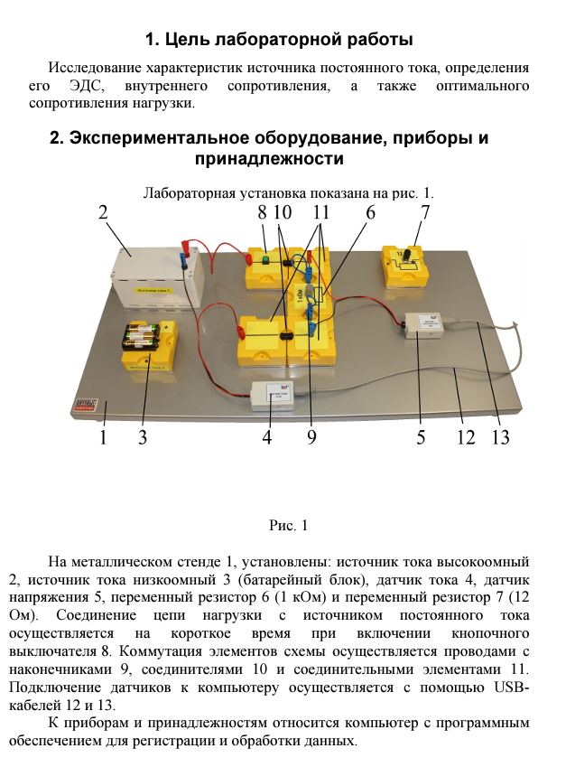 Исследование характеристик источника постоянного тока, определения его ЭДС, внутреннего сопротивления, а также оптимального сопротивления нагрузки. На металлическом стенде 1, установлены: источник тока высокоомный 2, источник тока низкоомный 3 (батарейный блок), датчик тока 4, датчик напряжения 5, переменный резистор 6 (1 кОм) и переменный резистор 7 (12 Ом). Соединение цепи нагрузки с источником постоянного тока осуществляется на короткое время при включении кнопочного выключателя 8. Коммутация элементов схемы осуществляется проводами с наконечниками 9, соединителями 10 и соединительными элементами 11. Подключение датчиков к компьютеру осуществляется с помощью USB- кабелей 12 и 13. К приборам и принадлежностям относится компьютер с программным обеспечением для регистрации и обработки данных.