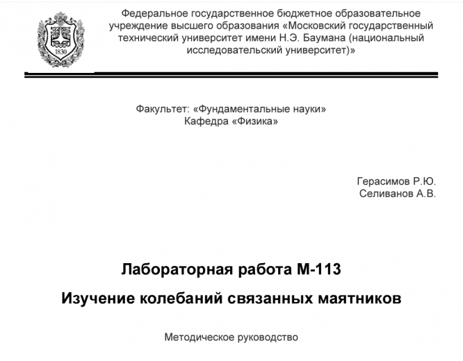 Для студентов МГТУ им. Н.Э.Баумана по предмету ФизикаИзучение колебаний связанных маятниковИзучение колебаний связанных маятников
