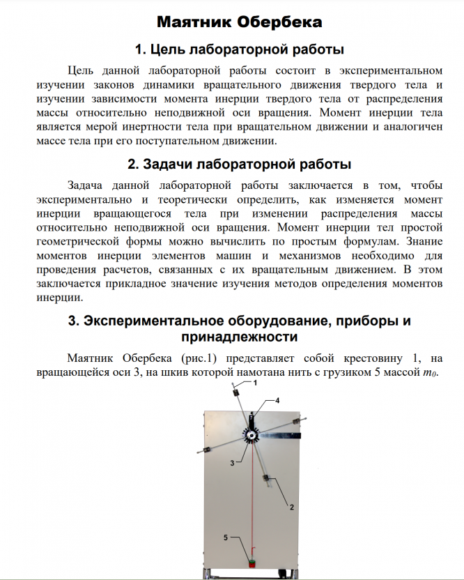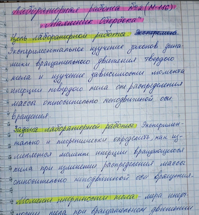 1. Цель лабораторной работы Цель данной лабораторной работы состоит в экспериментальном изучении законов динамики вращательного движения твердого тела и изучении зависимости момента инерции твердого тела от распределения массы относительно неподвижной оси вращения. Момент инерции тела является мерой инертности тела при вращательном движении и аналогичен массе тела при его поступательном движении.