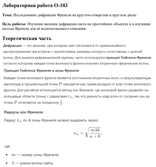 Лабораторная работа О: Исследование дифракции Френеля на круглом отверстии и круглом диске вариант 103