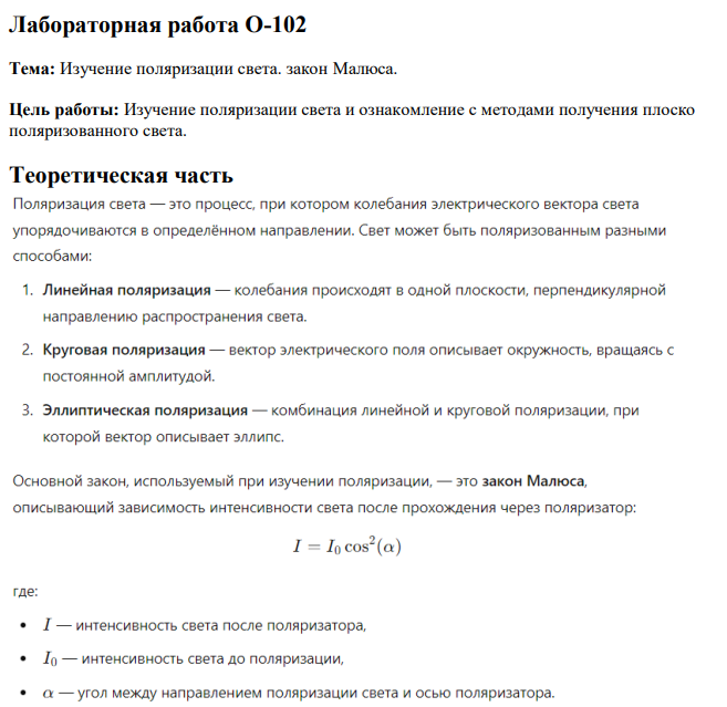 Лабораторная работа О: Изучение поляризации света. Закон Малюса вариант 102