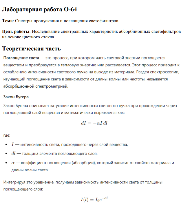 Лабораторная работа О: Спектры пропускания и поглощения светофильтров вариант 64