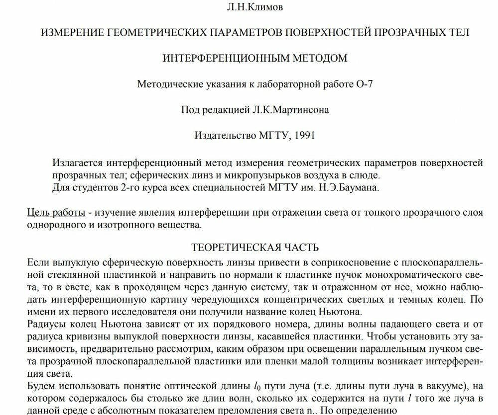 Для студентов МГТУ им. Н.Э.Баумана по предмету ФизикаИнтерференция в тонких пленках. Определение геометрических параметров поверхностей прозрачных тел интерференционным методомИнтерференция в тонких пленках. Определение геометрических параметров поверхностей прозрачных тел интерференционным методом