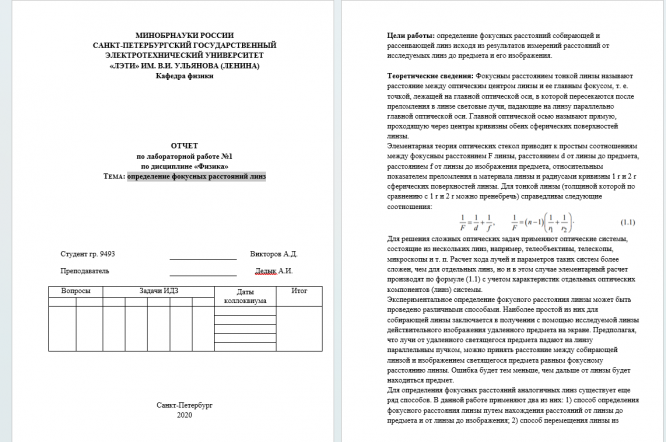 Для студентов СПбГЭТУ им. Ульянова (Ленина) по предмету ФизикаОпределение фокусных расстояний линзОпределение фокусных расстояний линз