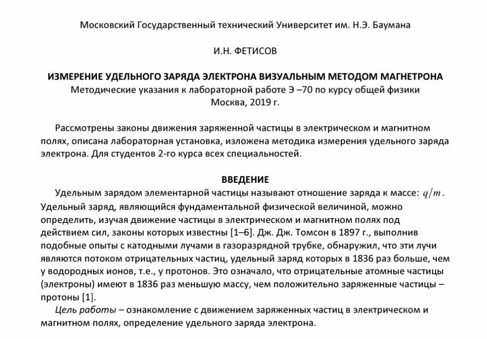 Для студентов МГТУ им. Н.Э.Баумана по предмету ФизикаИзмерение удельного заряда электрона визуальным методом магнетронаИзмерение удельного заряда электрона визуальным методом магнетрона