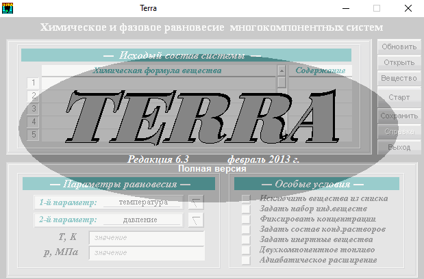 ПК "TERRA" - Программный комплекс для расчета произвольных систем с химическими и фазовыми превращениями Редкая версия программы редакция 6.3 февраль 2013г года со всеми дополнениями (в виде Triangle, Rectangle) и базой веществ