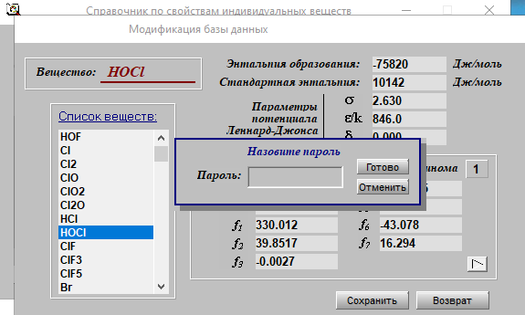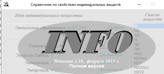 При использовании Базы данных по свойствам индивидуальных веществ (info.exe) при добавлении/редактировании вещества программа требует ввести пароль-код для доступа к базе данных (пароль находится в том же файле что и регистрационный ключ read_me.txt) !А теперь важное! Этот пароль нужно вводить цифрами расположенными с левой части клавиатуры, такая особенность программы, будьте внимательны! Иначе пароль программой не засчитается как верный.