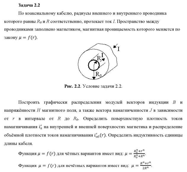 Задача 2.2. По коаксиальному кабелю, радиусы внешнего и внутреннего проводника которого равны R0 и R соответственно, протекает ток I. Пространство между проводниками заполнено магнетиком, магнитная проницаемость которого меняется по закону =f(r). Построить графически распределения модулей векторов индукции B и напряжённости H магнитного поля, а также вектора намагниченности J в зависимости от r в интервале от R до R0. Определить поверхностную плотность токов намагничивания i\'п на внутренней и внешней поверхностях магнетика и распределение объёмной плотности токов намагничивания i\'об(r). Определить индуктивность единицы длины кабеля. Функция =f(r) для чётных вариантов имеет вид: =(R0 n +rn )/(R0 n +Rn ).