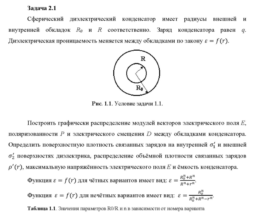 Задача 1.1. Сферический диэлектрический конденсатор имеет радиусы внешней и внутренней обкладок R0 Диэлектрическая проницаемость меняется между обкладкам Построить графически распределение модулей векторов электрического поля Е, поляризованности Р и электрического смещения D между обкладками конденсатора. Определить поверхностную плотность связанных зарядов на внутренней внешней  \' 2 поверхностях диэлектрика, распределение объёмной плотности связанных зарядов ’(r), максимальную напряжённость электрического поля Е и ёмкость конденсатора. Функция =f(r) для нечётных вариантов имеет вид: Функция =f(r) для чётных вариантов имеет вид: Таблица 1.1. Значения параметров n и R варианта ЭЛЕКТРОСТАТИКА По результатам проведённых вычислений построить графически зависимости D(r)/D(R), E(r)/E(R) в интервале значений r от R до R0 для задач 1.1, 1.2 и D(y)/D(0), E(y)/E(0) в интервале значений y от 0 до d для задачи 1.3.