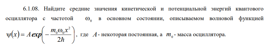 6.1.08. Найдите средние значения кинетической и потенциальной энергий квантового осциллятора с частотой 0 в основном состоянии, описываемом волновой функцией 2 2 0 0 m x x Aexp , где A- некоторая постоянная, а m0 - масса осциллятора. .