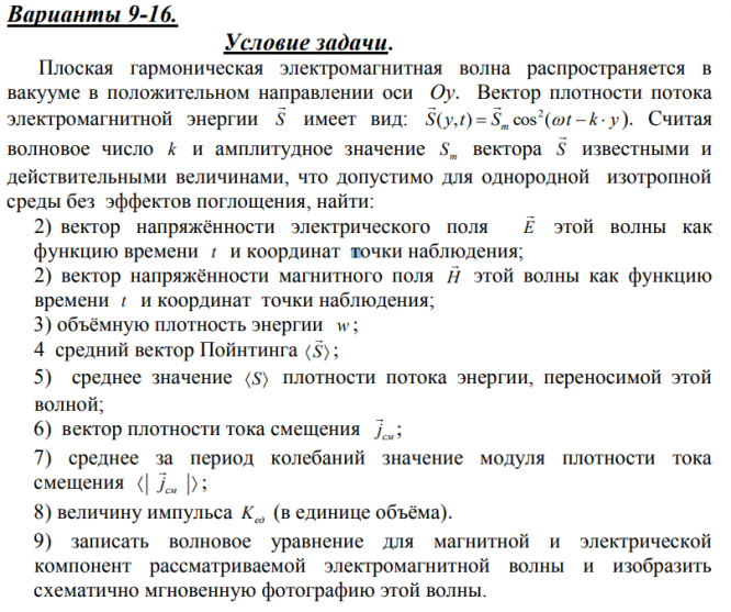 Варианты 9-16. Условие задачи. Плоская гармоническая электромагнитная волна распространяется в вакууме в положительном направлении оси Oy. Вектор плотности потока электромагнитной энергии S  имеет вид: S y t S t k y m ( , )  cos (   2   ). Считая волновое число k и амплитудное значение m S вектора S  известными и действительными величинами, что допустимо для однородной изотропной среды без эффектов поглощения, найти: 2) вектор напряжённости электрического поля E  этой волны как функцию времени t и координат точки наблюдения; 2) вектор напряжённости магнитного поля H  этой волны как функцию времени t и координат точки наблюдения; 3) объёмную плотность энергии w ; 4 средний вектор Пойнтинга S  ; 5) среднее значение S плотности потока энергии, переносимой этой волной; 6) вектор плотности тока смещения см j  ; 7) среднее за период колебаний значение модуля плотности тока смещения   см j  ; 8) величину импульса Kед (в единице объёма).