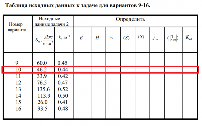 9) записать волновое уравнение для магнитной и электрической компонент рассматриваемой электромагнитной волны и изобразить схематично мгновенную фотографию этой волны. Таблица исходных данных к задаче для вариантов 9-16. .