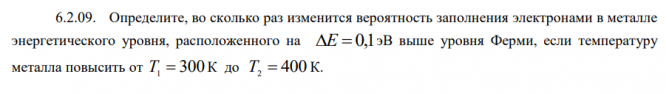 6.2.09. Определите, во сколько раз изменится вероятность заполнения электронами в металле энергетического уровня, расположенного на E 0,1 эВ выше уровня Ферми, если температуру металла повысить от T1 300 К до T2 400 К.
