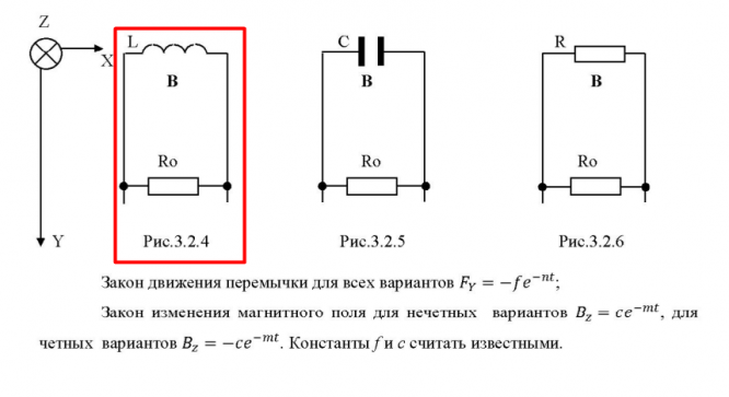 Найти: - закон изменения тока I(t); - закон движения перемычки Y = Y(t); - максимальное значение Ymax; - законы изменения проекции силы Лоренца на ось X (Fлx) и на ось Y (Fлy), действующей на электрон; - закон изменения напряженности электрического поля в перемычке E(t); - установить связь между силой Ампера, действующей на перемычку, и силой Лоренца, действующей на все электроны в перемычке. - построить зависимости тока через перемычку (I(t) / I max), Y(t)/Y(0). Z L C R X B B B Ro Ro Ro Y Рис.3.2.4 Рис.3.2.5 Рис.3.2.6 Закон изменения силы для всех вариантов FY = -f exp (-nt); Закон изменения магнитного поля для нечетных вариантов ВZ = c exp(- mt), для четных вариантов ВZ = -c exp(- mt), Константы f и c считать известными.