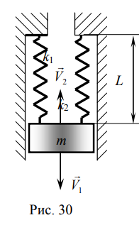 Каждая колебательная система (КС), представленная на рис. 28, 29, 30, 31, состоит из шайбы массой m и двух упругих пружин, имеющих жесткости k1 и k2 . Движение КС происходит в окружающей среде с малыми вязкими свойствами (малым коэффициентом сопротивления r). На рис. 28, 30 шайба колеблется под действием пружин, соединенных параллельно, а на рис. 29, 31 колебания происходят под действием пружин, соединенных последовательно. Массой пружин можно пренебречь. На рис. 28, 29 КС имеет горизонтальное расположение, а на рис. 30, 31 вертикальное расположение в поле силы тяжести. Длины 1-ой и 2-ой пружин в недеформированных состояниях равны l10 и l20. На рис.28, 30 L - длина каждой пружины в деформированном состоянии при t=0. На рис.29, 31 L - общая длина двух пружин в деформированном состоянии при t=0. Возможные векторы начальной скорости шайбы равны V1 , V2 . Шайбу, находящуюся в положении равновесия, смещают до расстояния L, а затем импульсом придают ей в начальный момент времени t=0 скорость V1 или V2 , в соответствии с заданием (см. таблицы № 10 - 13). В результате КС приходит в колебательное движение.
