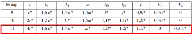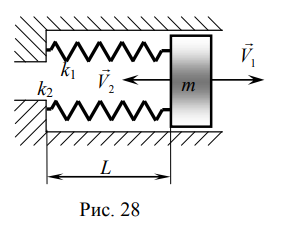 Каждая колебательная система (КС), представленная на рис. 28, 29, 30, 31, состоит из шайбы массой m и двух упругих пружин, имеющих жесткости k1 и k2 . Движение КС происходит в окружающей среде с малыми вязкими свойствами (малым коэффициентом сопротивления r). На рис. 28, 30 шайба колеблется под действием пружин, соединенных параллельно, а на рис. 29, 31 колебания происходят под действием пружин, соединенных последовательно. Массой пружин можно пренебречь. На рис. 28, 29 КС имеет горизонтальное расположение, а на рис. 30, 31 вертикальное расположение в поле силы тяжести. Длины 1-ой и 2-ой пружин в недеформированных состояниях равны l10 и l20. На рис.28, 30 L - длина каждой пружины в деформированном состоянии при t=0. На рис.29, 31 L - общая длина двух пружин в деформированном состоянии при t=0. Возможные векторы начальной скорости шайбы равны V1 , V2 . Шайбу, находящуюся в положении равновесия, смещают до расстояния L, а затем импульсом придают ей в начальный момент времени t=0 скорость V1 или V2 , в соответствии с заданием (см. таблицы № 10 - 13). В результате КС приходит в колебательное движение.
