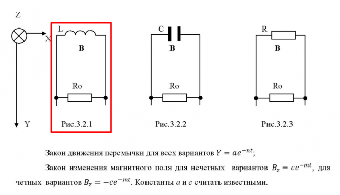 Найти: - закон изменения тока I (t); - максимальное значение тока I max; - закон изменения проекций силы Лоренца на ось X (Fлx) и на ось Y (Fлy), действующей на электрон ; - закон изменения напряженности электрического поля в перемычке E(t); - силу F(t), действующую на перемычку, необходимую для обеспечения заданного закона движения ; - установить связь между силой Ампера, действующей на перемычку, и силой Лоренца, действующей на все электроны в перемычке. Z L C R X B B B Ro Ro Ro Y Рис.3.2.1 Рис.3.2.2 Рис.3.2.3 Закон движения перемычки для всех вариантов Y = a exp(- nt); Закон изменения магнитного поля для нечетных вариантов ВZ = c exp(- mt), для четных вариантов ВZ = -c exp(- mt).