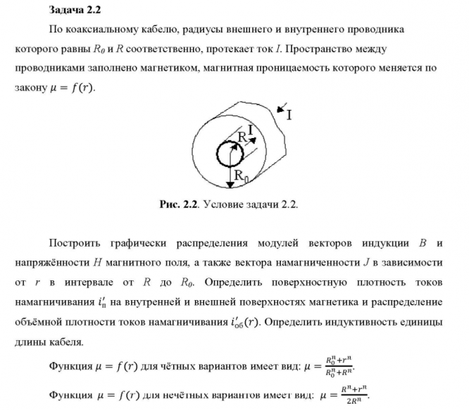 Задача 2.2. По коаксиальному кабелю, радиусы внешнего и внутреннего проводника которого равны R0 и R соответственно, протекает ток I. Пространство между проводниками заполнено магнетиком, магнитная проницаемость которого меняется по закону =f(r). Построить графически распределения модулей векторов индукции B и напряжённости H магнитного поля, а также вектора намагниченности J в зависимости от r в интервале от R до R0. Определить поверхностную плотность токов намагничивания i\'п на внутренней и внешней поверхностях магнетика и распределение объёмной плотности токов намагничивания i\'об(r). Определить индуктивность единицы длины кабеля. Функция =f(r) для чётных вариантов имеет вид: =(R0 n +rn )/(R0 n +Rn ).