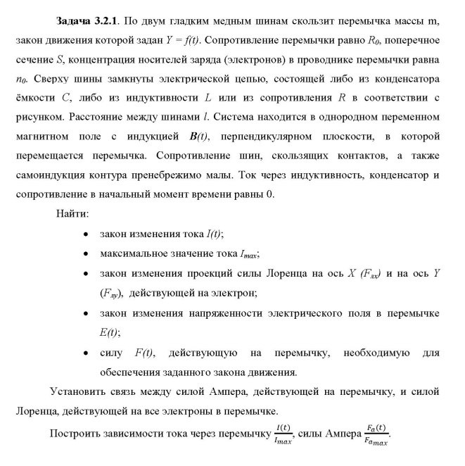Задача 3.2.1 По двум гладким медным шинам скользит перемычка массы m, закон движения которой задан Y = f(t). Сопротивление перемычки равно Ro, поперечное сечение S, концентрация носителей заряда (электронов) в проводнике перемычки равна n0. Сверху шины замкнуты электрической цепью, состоящей либо из конденсатора ёмкости С, либо из индуктивности L или из сопротивления R в соответствии с рисунком. Расстояние между шинами l. Система находится в однородном переменном магнитном поле с индукцией B(t), перпендикулярном плоскости, в которой перемещается перемычка. Сопротивление шин, скользящих контактов, а также самоиндукция контура пренебрежимо малы. Ток через индуктивность, конденсатор и сопротивление в начальный момент времени равен 0.