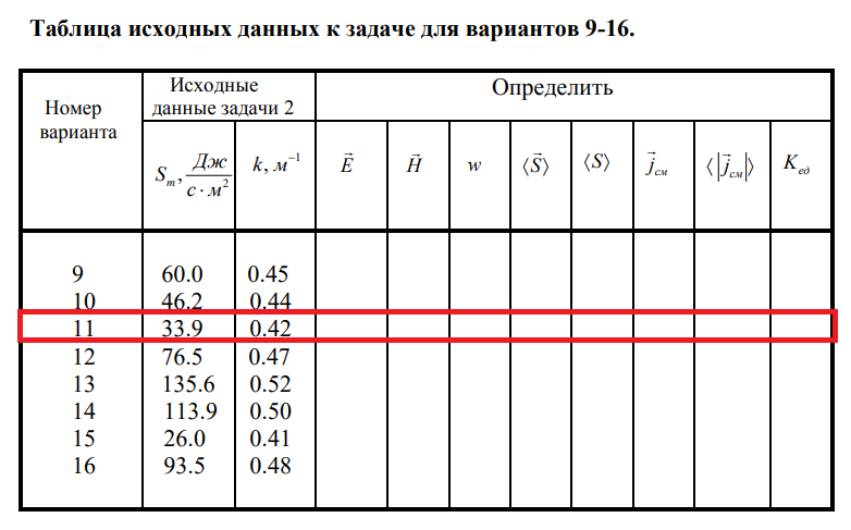 9) записать волновое уравнение для магнитной и электрической компонент рассматриваемой электромагнитной волны и изобразить схематично мгновенную фотографию этой волны. Таблица исходных данных к задаче для вариантов 9-16. .