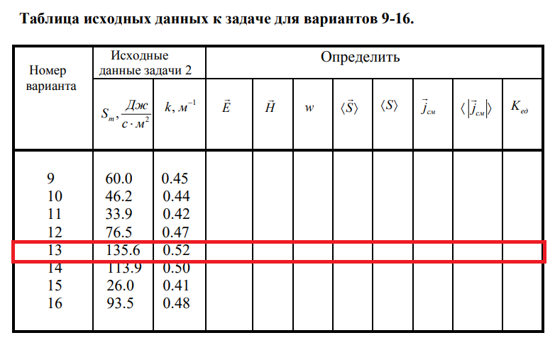 9) записать волновое уравнение для магнитной и электрической компонент рассматриваемой электромагнитной волны и изобразить схематично мгновенную фотографию этой волны. Таблица исходных данных к задаче для вариантов 9-16. .