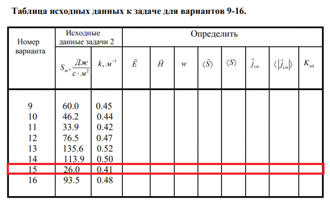 9) записать волновое уравнение для магнитной и электрической компонент рассматриваемой электромагнитной волны и изобразить схематично мгновенную фотографию этой волны. Таблица исходных данных к задаче для вариантов 9-16. .
