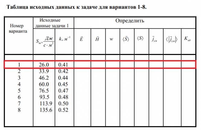 9) записать волновое уравнение для магнитной и электрической компонент рассматриваемой электромагнитной волны и изобразить схематично мгновенную фотографию этой волны. Таблица исходных данных к задаче для вариантов 1-8..