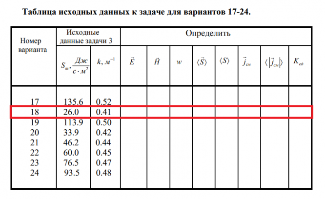 9) записать волновое уравнение для магнитной и электрической компонент рассматриваемой электромагнитной волны и изобразить схематично мгновенную фотографию этой волны. Таблица исходных данных к задаче для вариантов 17-24. .