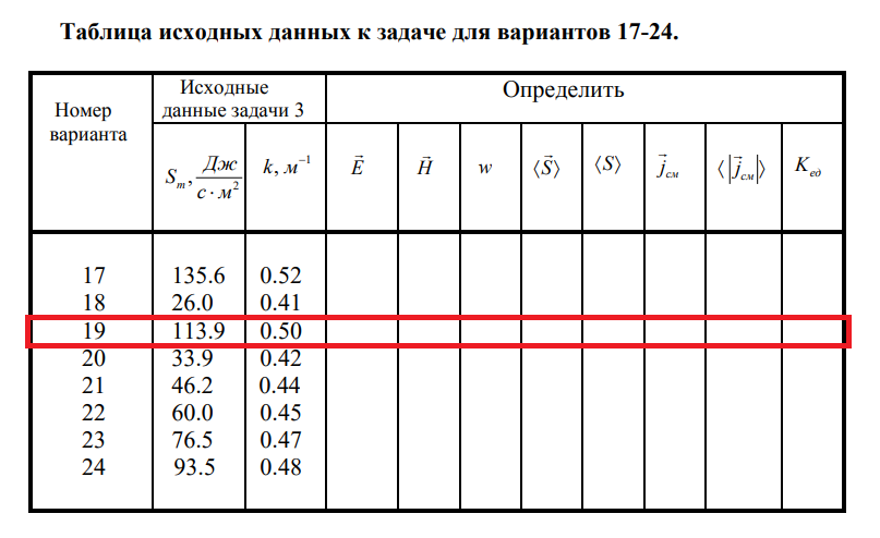 9) записать волновое уравнение для магнитной и электрической компонент рассматриваемой электромагнитной волны и изобразить схематично мгновенную фотографию этой волны. Таблица исходных данных к задаче для вариантов 17-24. .