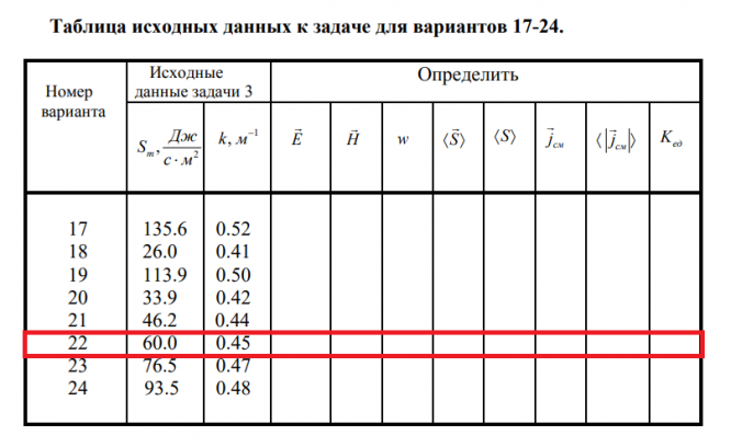 9) записать волновое уравнение для магнитной и электрической компонент рассматриваемой электромагнитной волны и изобразить схематично мгновенную фотографию этой волны. Таблица исходных данных к задаче для вариантов 17-24. .