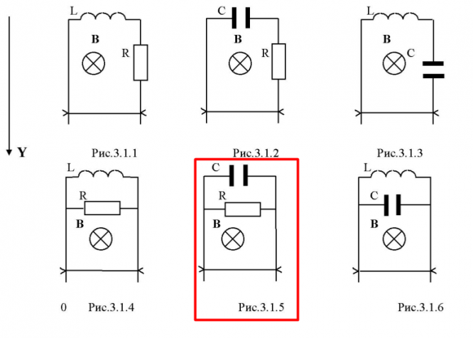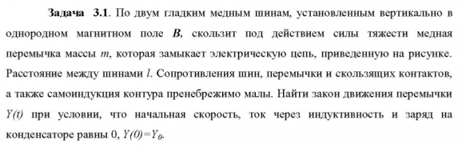 Задача 3.1. По двум гладким медным шинам, установленным вертикально в однородном магнитном поле B скользит под действием силы тяжести медная перемычка массы m, которая замыкает электрическую цепь, приведенную на рисунке. Расстояние между шинами l. Сопротивления шин, перемычки и скользящих контактов, а также самоиндукция контура пренебрежимо малы. Найти закон движения перемычки Y(t) при условии, что начальная скорость, ток через индуктивность и заряд на конденсаторе равны 0, Y(0)=Y0. L C L B B B R R C Y Рис.3.1.1 Рис.3.1.2 Рис.3.1.3 L C L R R C B B B 0 Рис.3.1.4 Рис.3.1.5 Рис.3.1.6 Таблица 3.1.1 Номера вариантов и значения параметров L , R , C для соответствующего номера рисунка.  .