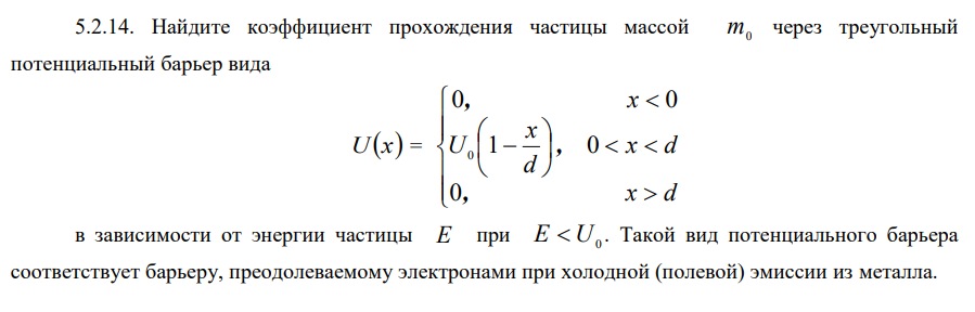 5.2.14. Найдите коэффициент прохождения частицы массой m0 через треугольный потенциальный барьер вида Ux =                  x d x d d x U x , , , 0 1 0 0 0 0 в зависимости от энергии частицы E при E  U0 . Такой вид потенциального барьера соответствует барьеру, преодолеваемому электронами при холодной (полевой) эмиссии из металла. .