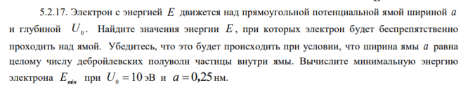 5.2.17. Электрон с энергией E движется над прямоугольной потенциальной ямой шириной a и глубиной U0 . Найдите значения энергии E , при которых электрон будет беспрепятственно проходить над ямой. Убедитесь, что это будет происходить при условии, что ширина ямы a равна целому числу дебройлевских полуволн частицы внутри ямы. Вычислите минимальную энергию электрона Emin при U0 10 эВ и a 0,25 нм..