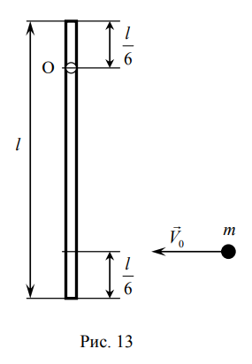 Однородный жёсткий стержень длиной l=1 м и массой M=1 кг свободно висит на горизонтальной идеально гладкой оси вращения О, как показано на рис. 13.